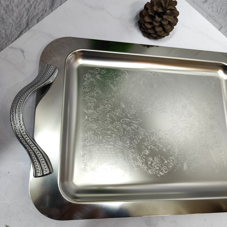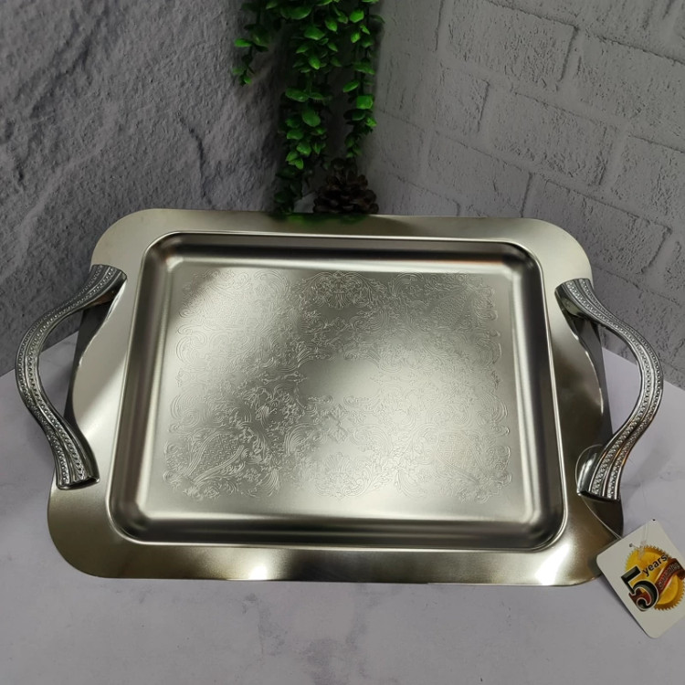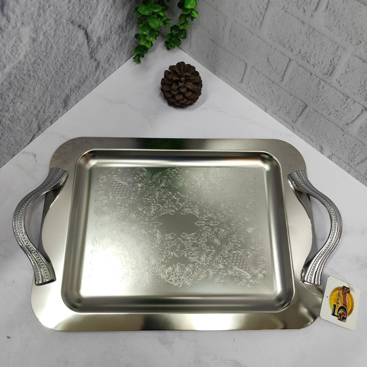 ساخته شده با ورق استیل 0/8ضخیم کف طرح دار پرداخت بسیار عالی دسته ها از جنس زاماک(آلیاژ روی و آلومینیوم) سایز متوسط(37در26) مستطیل جعبه دار برنده (ایده) مخصوص پذیرایی و کادویی دو سایز داره که این سایز متوسطه سایز بزرگتر هم موجوده