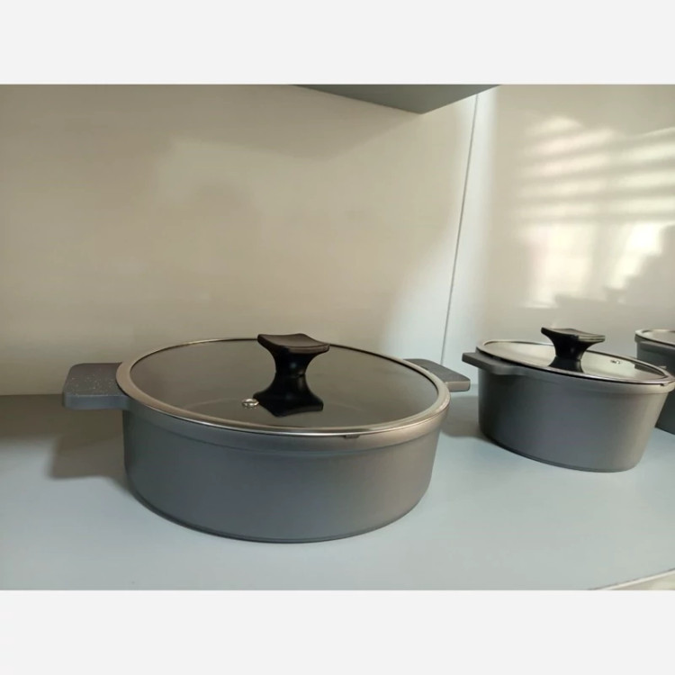 ساخته شده با چدن آلومینیوم ضخیم گرانیت دو لایه درجه یک خارجی در دو رنگ مسکی و طوسی کف قابلمه اینداکشن(مثل شعله پخش کن عمل میکنه) دارای 3قابلمه به سایزهای (28،24,20) و تابه ی سایز 28 جنس دسته سر قابلمه قالب جدید اروپا درب پیرکس قپه های باکالیت قیمت فوق اقتصادی برند ای ام دی