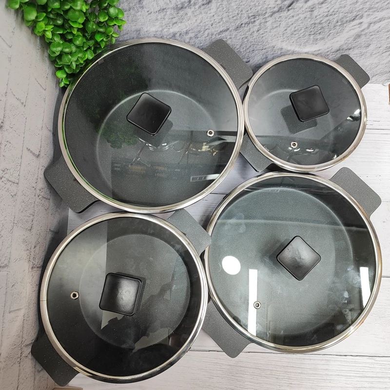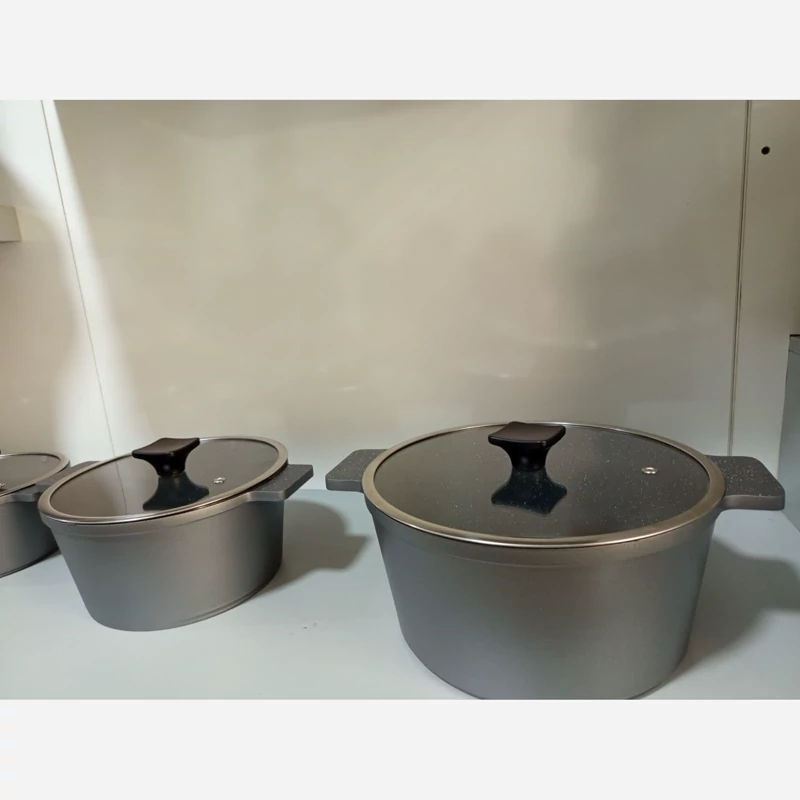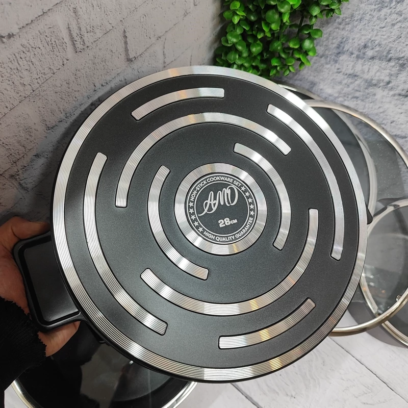 ساخته شده با چدن آلومینیوم ضخیم گرانیت دو لایه درجه یک خارجی در دو رنگ مسکی و طوسی کف قابلمه اینداکشن(مثل شعله پخش کن عمل میکنه) دارای 3قابلمه به سایزهای (28،24,20) و تابه ی سایز 28 جنس دسته سر قابلمه قالب جدید اروپا درب پیرکس قپه های باکالیت قیمت فوق اقتصادی برند ای ام دی