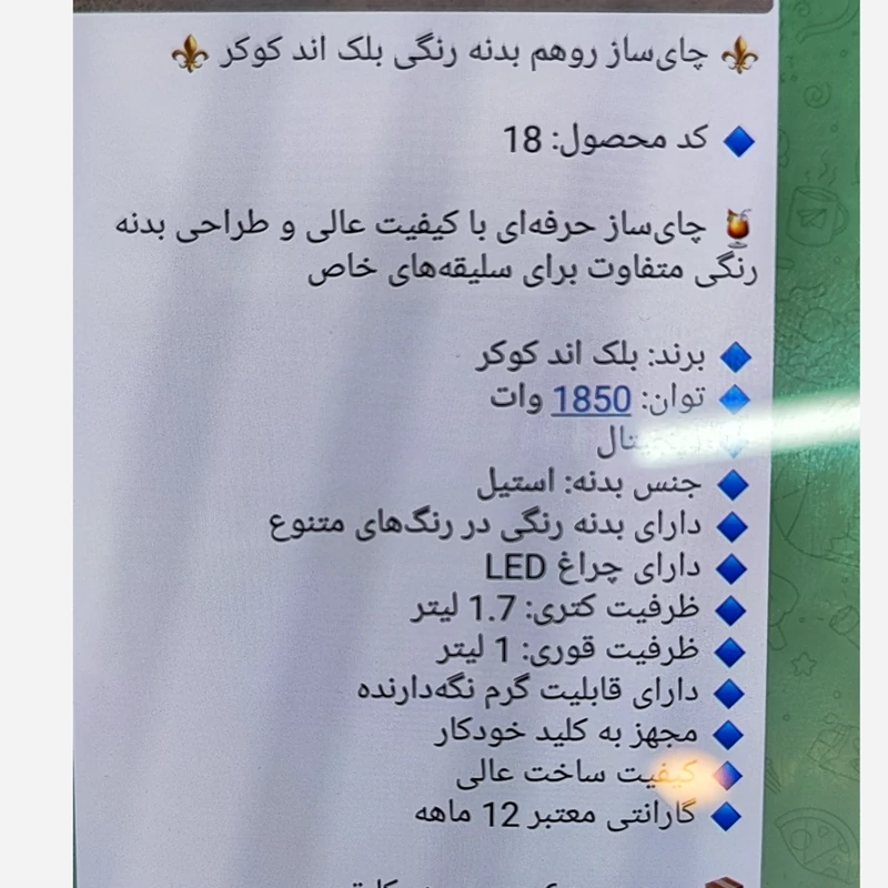 جنس بدنه استیل دارای بدنه رنگی (سفید) مشکی هم موجوده دارای چراغ led ابی رنگ ظرفیت کتری :1.7 لیتر ظرفیت قوری :1 لیتر قابلیت گرم نگهدارنده داره مجهز به کلید خودکار دارای گارنتی معتبر 12ماهه برند بلک کوکر