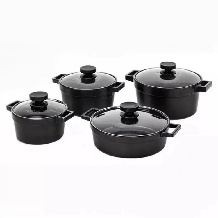 چدن آلومینیوم سنگین و ضخیم گرانیت 3لایه اعلا 8 پارچه مفید دارای قابلمه های سایز 28,24,20 و تابه ی سایز 28 درب پیرکس قپه های باکالیت دسته ها هم جنس قابلمه برند یونیک