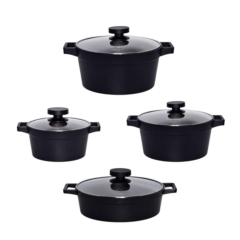 چدن آلومینیوم سنگین و ضخیم گرانیت 3لایه اعلا 8 پارچه مفید دارای قابلمه های سایز 28,24,20 و تابه ی سایز 28 درب پیرکس قپه های باکالیت دسته ها هم جنس قابلمه برند یونیک