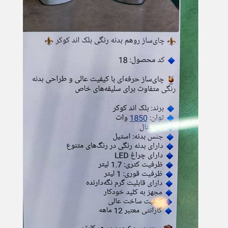 جنس بدنه استیل دارای بدنه رنگی (مشکی) سفید هم موجوده دارای چراغ led ابی رنگ ظرفیت کتری :1.7 لیتر ظرفیت قوری :1 لیتر قابلیت گرم نگهدارنده داره مجهز به کلید خودکار دارای گارنتی معتبر 12ماهه برند بلک کوکر
