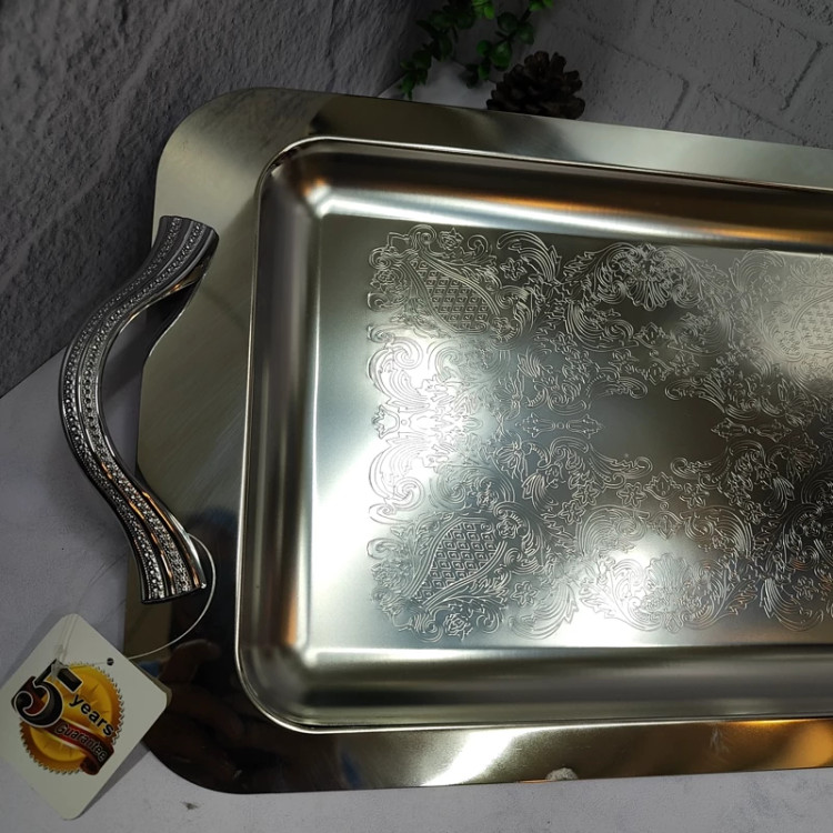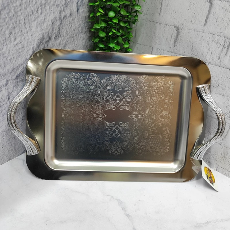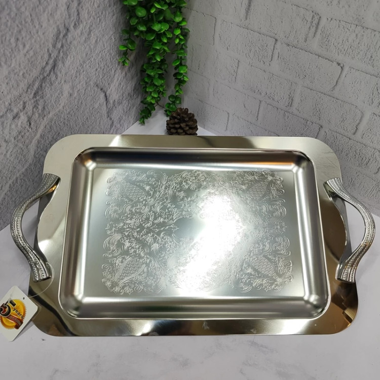 ساخته شده با ورق استیل 0/8ضخیم کف طرح دار پرداخت بسیار عالی دسته ها از جنس زاماک(آلیاژ روی و آلومینیوم) سایز بزرگ(46/5در30) مستطیل جعبه دار برنده (ایده) مخصوص پذیرایی و کادویی دو سایز داره که این سایز بزرگه سایز کوچکتر هم موجوده