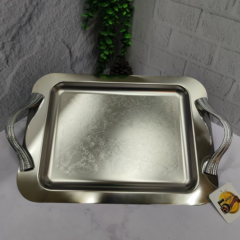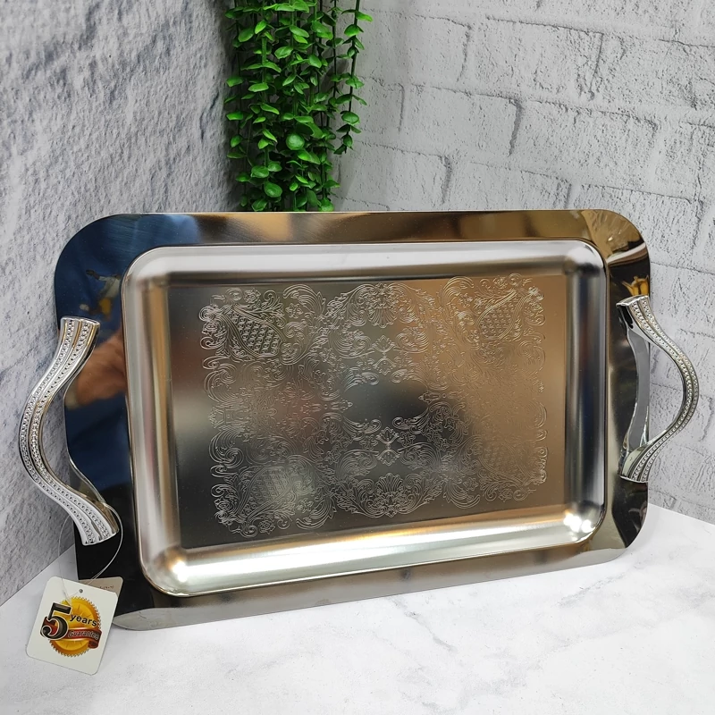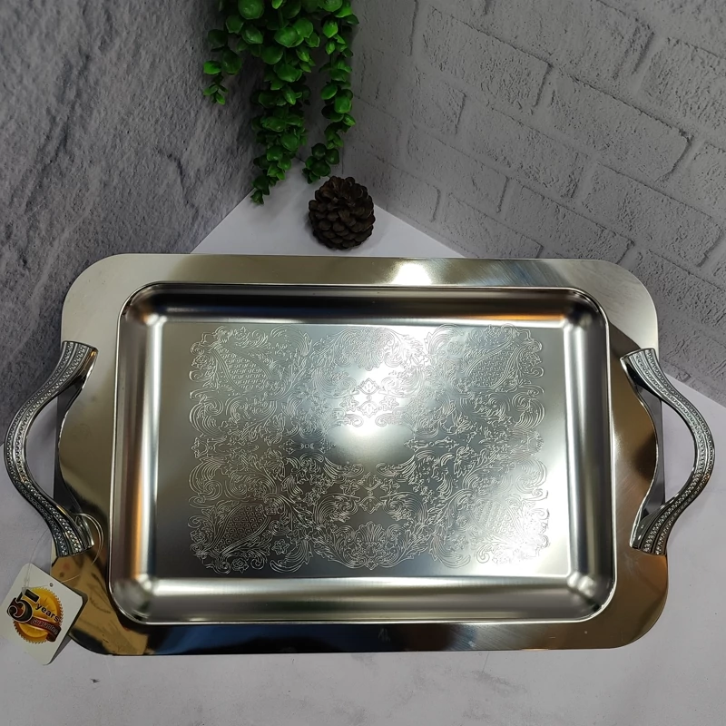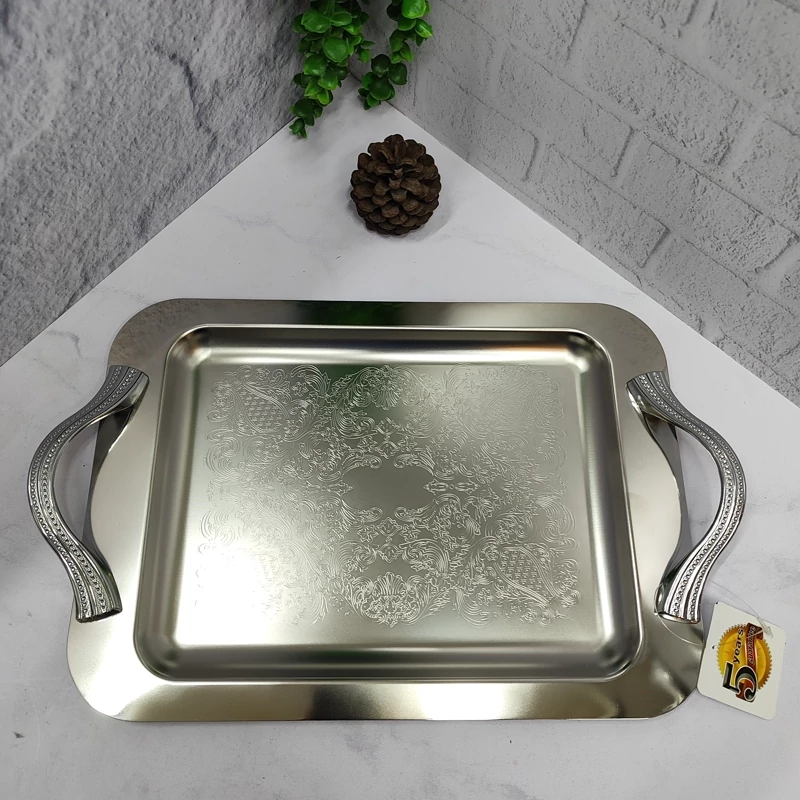 ساخته شده با ورق استیل 0/8ضخیم کف طرح دار پرداخت بسیار عالی دسته ها از جنس زاماک(آلیاژ روی و آلومینیوم) سایز بزرگ(46/5در30) مستطیل جعبه دار برنده (ایده) مخصوص پذیرایی و کادویی دو سایز داره که این سایز بزرگه سایز کوچکتر هم موجوده
