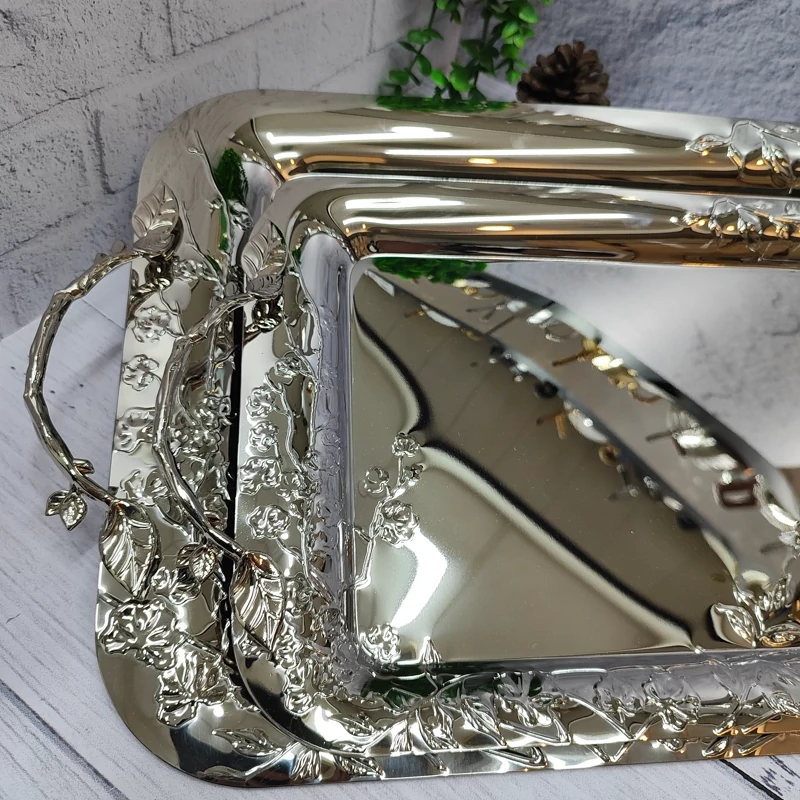 ساخته شده با ورق استیل(نگیر) یک میل ضخیم سنگین و خوش نقش مدل دسته برگی دسته ها از جنس زاماک(آلیاژ روی و آلومینیوم) در دو سایز کوچک و بزرگ اندازه سایز بزرگ(45در30)بدون احتساب دسته ها اندازه سایز کوچک(35در 24) بدون احتساب دسته ها مناسب پذیرایی و کادویی دارای جعبه ی رنگی شکیل کادویی پشت سینی ها مات و ضد خش برند(یونی هوم)