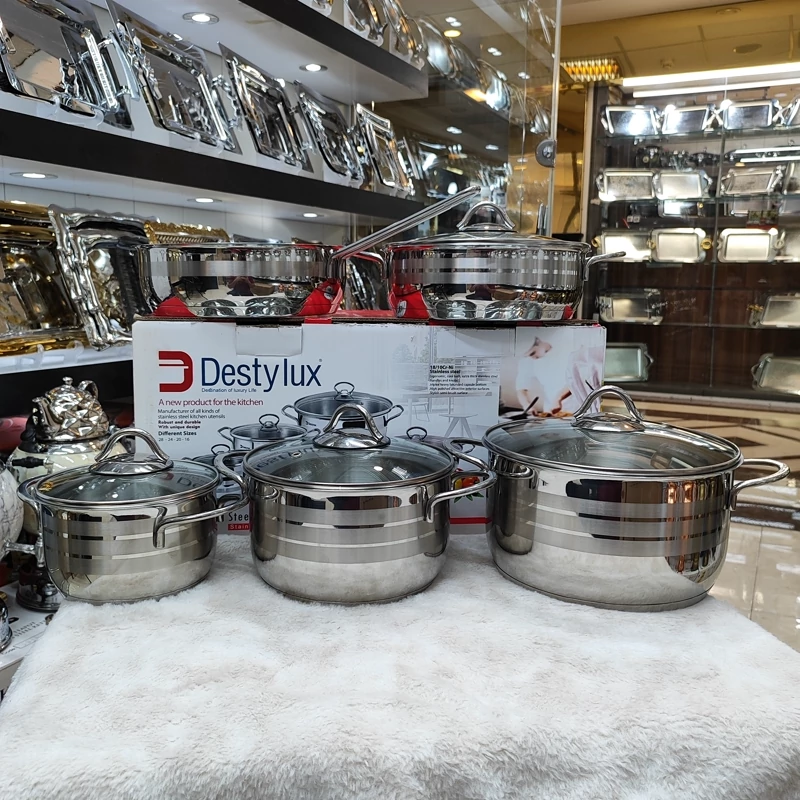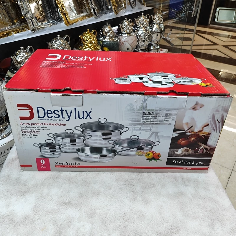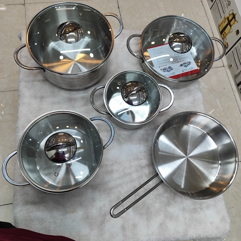 سرویس 9پارچه ساخته شده با استیل ضخیم و سنگین کف کار چدنه که در برابر حرارت زیاد مقاوم و ایمن میکنه قابلمه هاتونو درب پیرکس قالب قابلمه ها بزرگن سایز 24 20 16 و تاوه های سایز 24 یک عدد تابه درب دار دو دسته و یک عدد بی در تک دسته