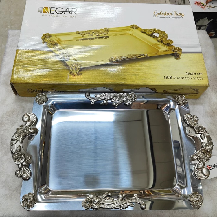 ساخته شده با استیل ورق 0/8 بسیار ضخیم نگیر طرح گلستان کد320 بسیار شکیل پایه دار دسته ها و پایه ها از جنس زاماک درجه یک دسته و پایه ها آبکاری رنگ ثابت تضمینی ابعاد سایز بزرگ بدون احتساب دسته ها(45در 30/5) جعبه کادویی زیبا و مقاوم کاور دار 24ماه ضمانت