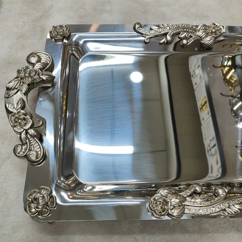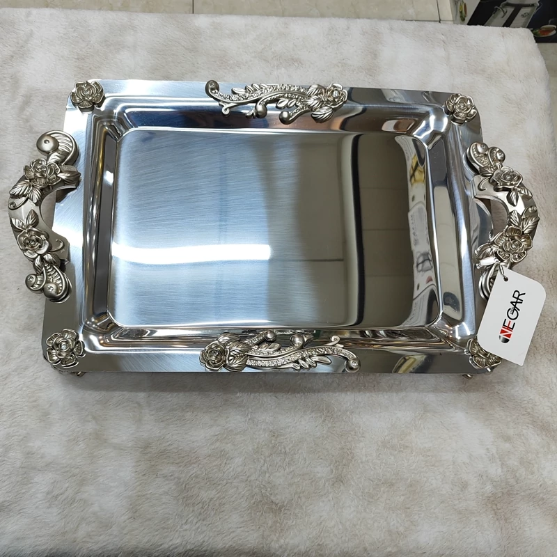 ساخته شده با استیل ورق 0/8 بسیار ضخیم نگیر طرح گلستان کد320 بسیار شکیل پایه دار دسته ها و پایه ها از جنس زاماک درجه یک دسته و پایه ها آبکاری رنگ ثابت تضمینی ابعاد سایز بزرگ بدون احتساب دسته ها(45در 30/5) جعبه کادویی زیبا و مقاوم کاور دار 24ماه ضمانت