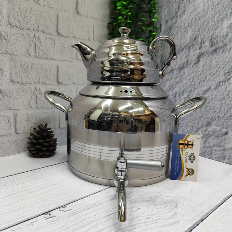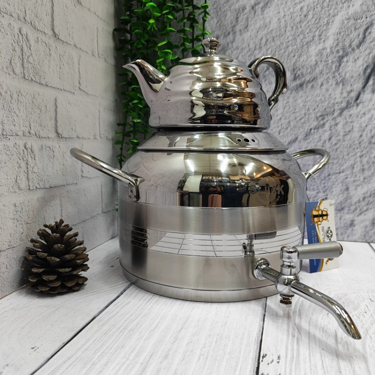از تولیدات کارخانه با ورق استیل یک میل ضخیم کفه چدنی کتری بسیار ایمن و مقاومه که با خیال راحت میتونید روی حرارت زیاد استفاده کنید گنجایش 5لیتر آب مدل طرح ترک دسته و شیر خارجی اعلا دارای درب شبکه ای قوری چینی کروم شده با طراحی زیبا ضمانت 24 ماهه برند اس لوکس