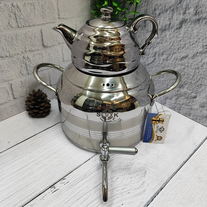 از تولیدات کارخانه با ورق استیل یک میل ضخیم کفه چدنی کتری بسیار ایمن و مقاومه که با خیال راحت میتونید روی حرارت زیاد استفاده کنید گنجایش 5لیتر آب مدل طرح ترک دسته و شیر خارجی اعلا دارای درب شبکه ای قوری چینی کروم شده با طراحی زیبا ضمانت 24 ماهه برند اس لوکس