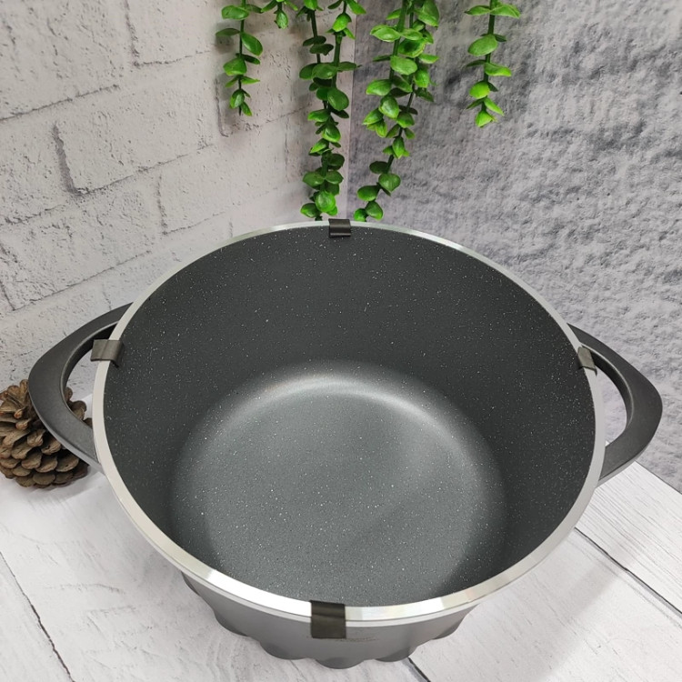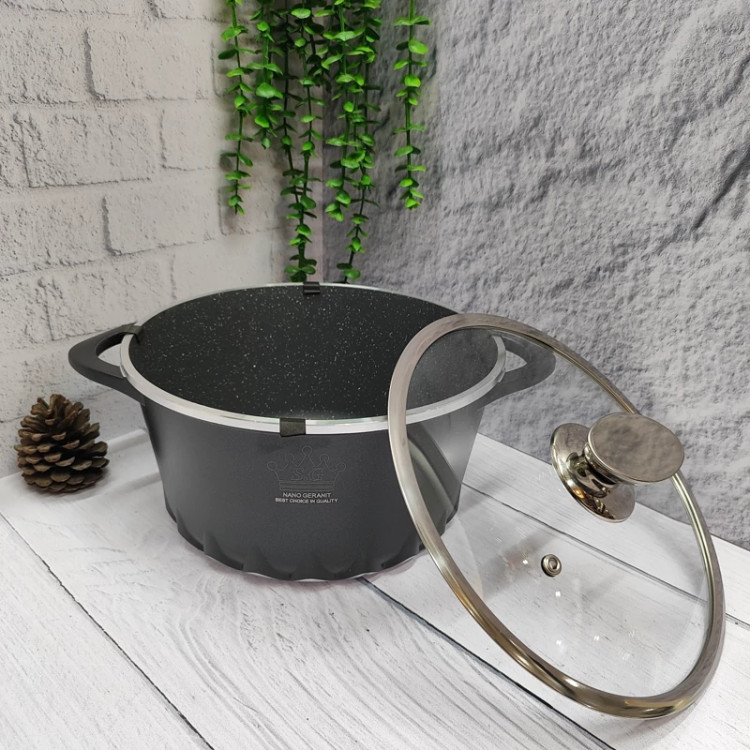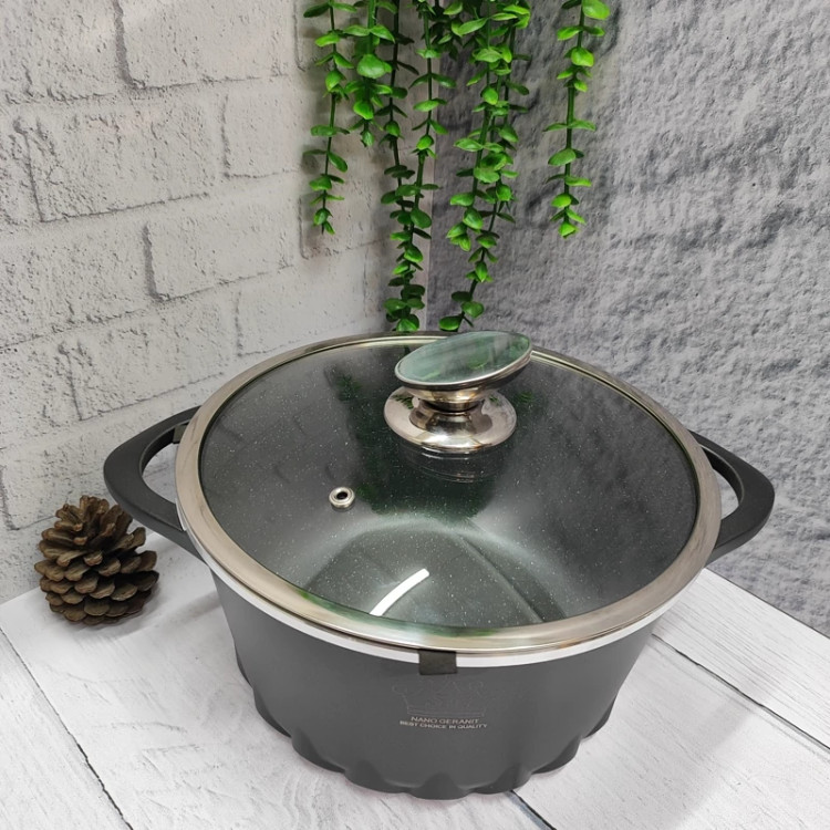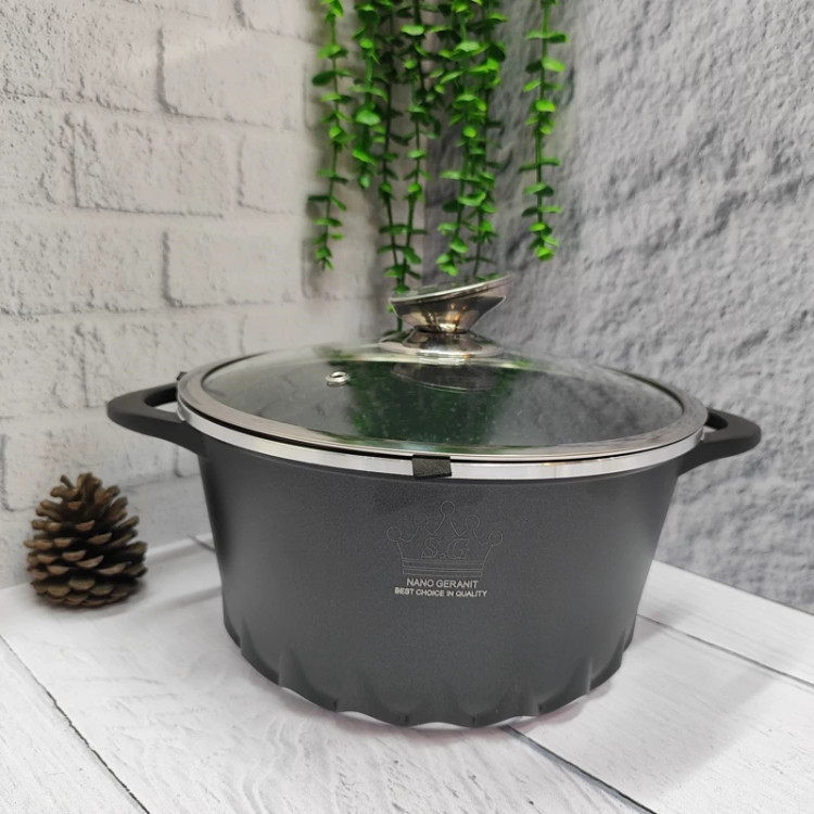 بهترین برند موجود در بازار چدن سنگین و ضخیم دارای درب پیرکس قپه و زه استیل داخل تمام گرانیت کف اینداکشن سایز 24 ارتفاع قابلمه بدون درب 13 سانتی متر رنگ مشکی برند اس جی