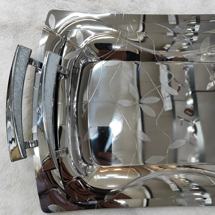استیل یک میل ضخیم خارجی جنس دسته ها زاماک (آلیاژ روی و آلومینیوم)درجه یک در دو سایز بزرگ و کوچک استاندارد کاربردی . طرح برگ سایز سینی بزرگ(42در30) سایز سینی کوچک(35در25) دارای جعبه کادویی زیبا همراه با کاور برند وینکس
