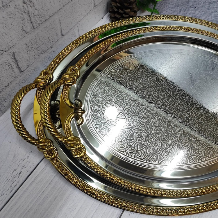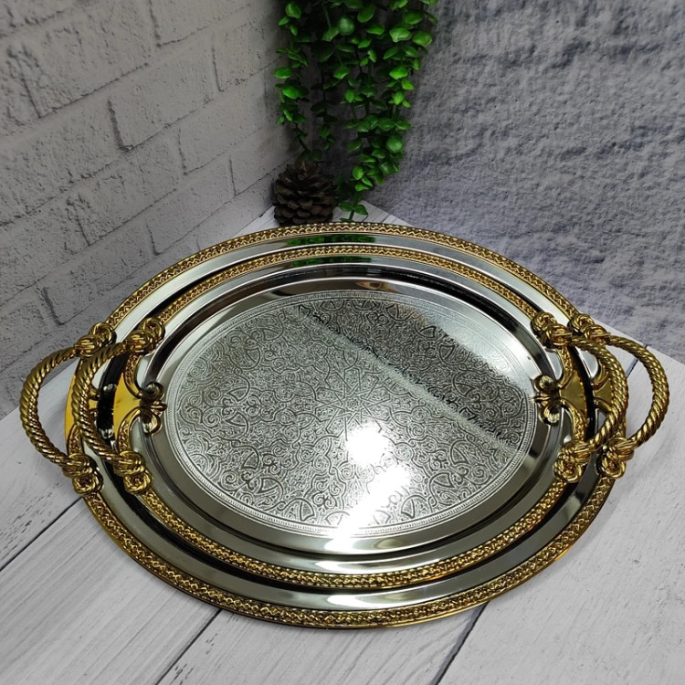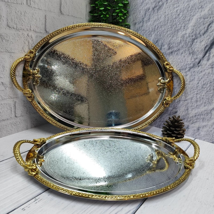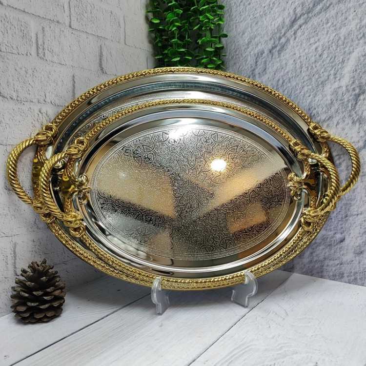 فلزی ضخیم با ورق 0/6 سیلور دور و دسته طلایی کف سینی طرح دار دو عددی در دو سایز بزرگ و کوچک سایز بزرگ(41/5در31/5)بدون احتساب دسته سایز کوچک(34/5 در 26) بدون احتساب دسته دسته ها از جنس زاماک(آلیاژ روی و الومینیوم) جعبه کادویی زیبا برند وینکس