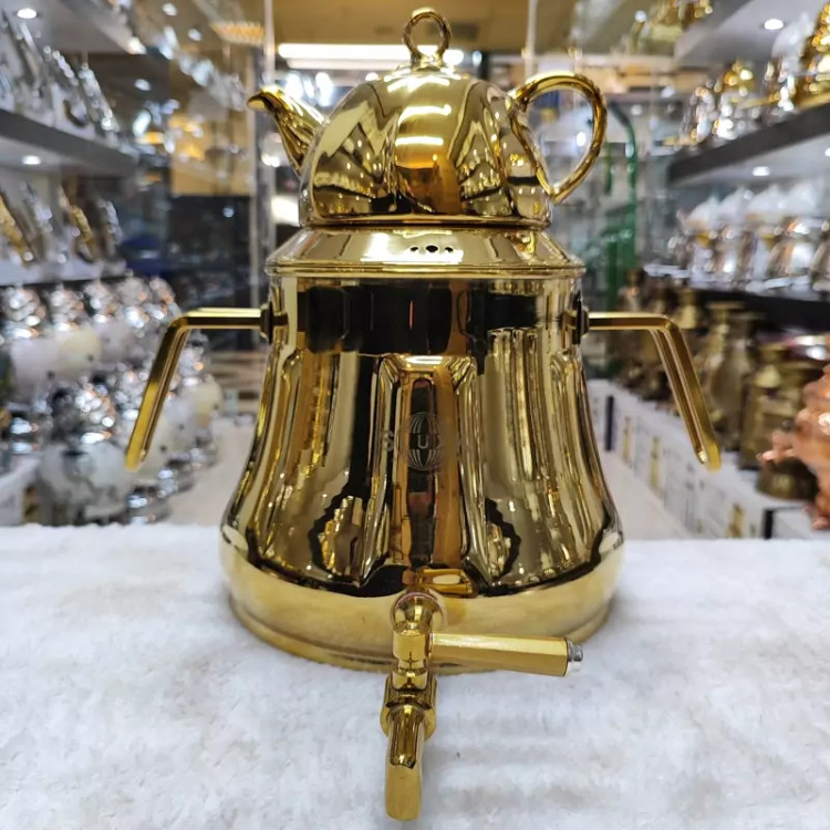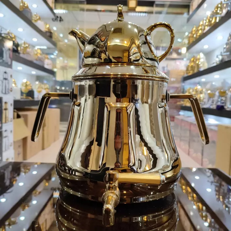 از تولیدات کارخانه با ورق استیل فوق ضخیم یک و نیم میل قالب این کار انحصار خودمونه و نمونه ی مشابهی هیچ تولیدی نداره گنجایش کتری 6لیتریه کفه چدنی بسیار مقاوم و ایمن داره که راحت میتونید روی حرارت بسیار زیاد با خیال راحت استفاده کنید رنگ طلایی کار ثابت و تضمینی هستش و از بین نمیره دسته های ضخیم و شیر خارجی داره دارای درب شبکه ای قوری کروم شده طلایی زیبا با ضمانت 24 ماهه برند اس لوکس