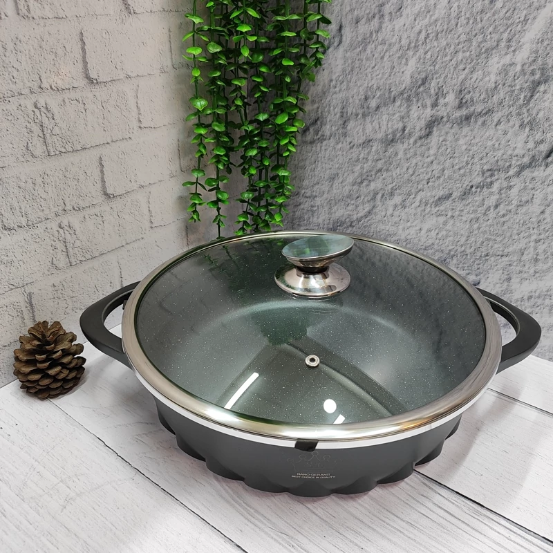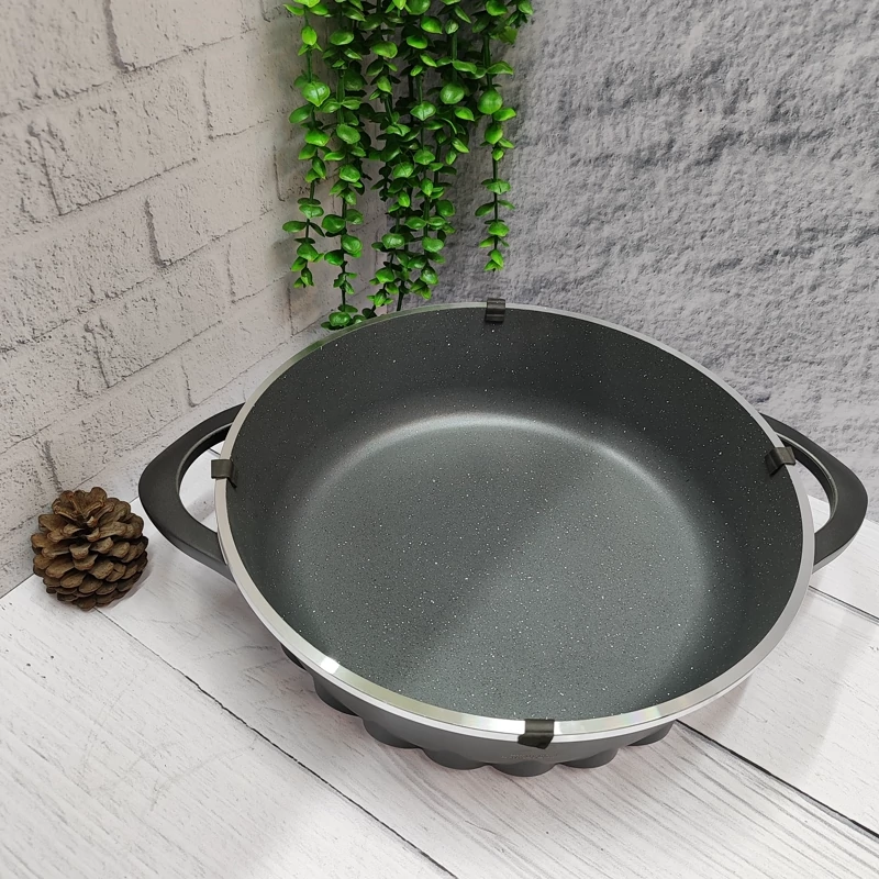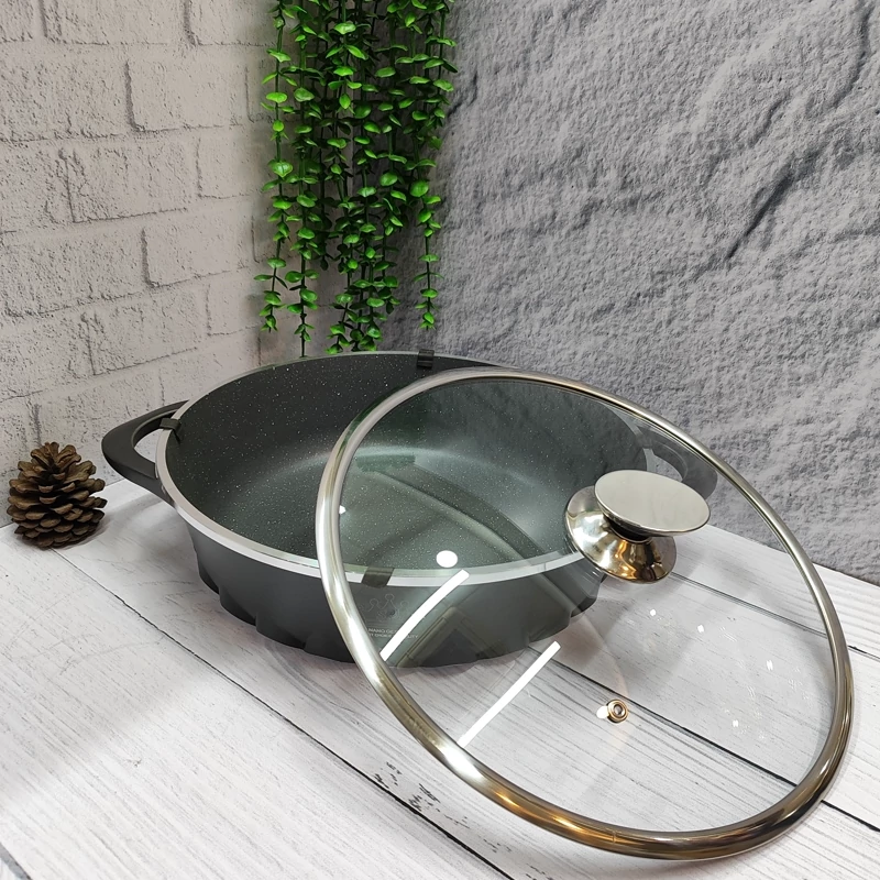 بهترین برند موجود در بازار چدن سنگین و ضخیم دارای درب پیرکس قپه و زه استیل داخل تمام گرانیت کف اینداکشن سایز 32 ارتفاع تابه بدون درب 9سانتی متر رنگ مشکی برند اس جی
