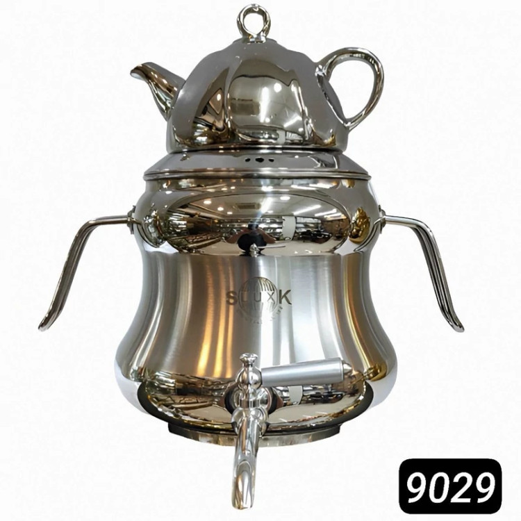 از تولیدات کارخانه با ورق استیل یک میل ضخیم کفه چدنی کف کتری که ایمنی کار که در برابر حرارت رو بالا میبره گنجایش 6لیتری کتری دسته عصایی و شیر درجه یک خارجی قوری چینی کروم شده با طراحی زیبا دارای درب شبکه ای ضمانت 24 ماهه برند اس لوکس