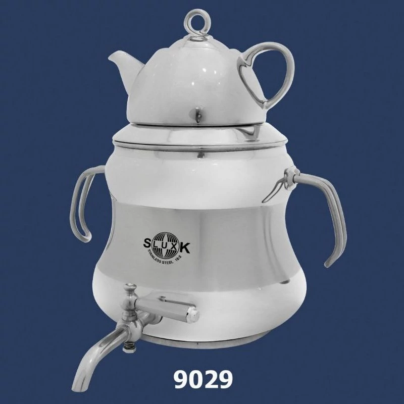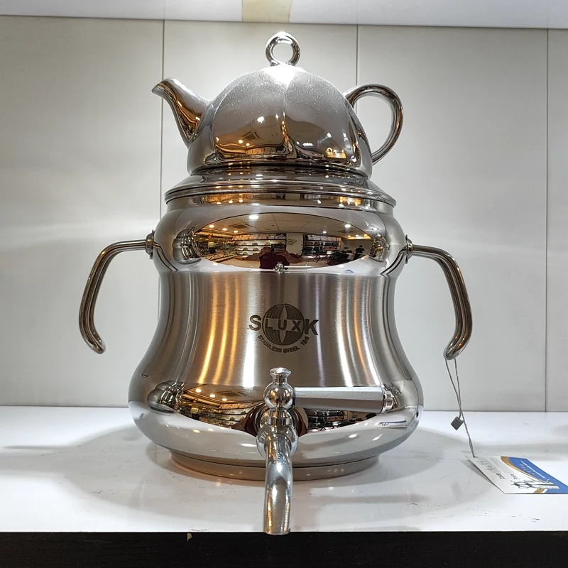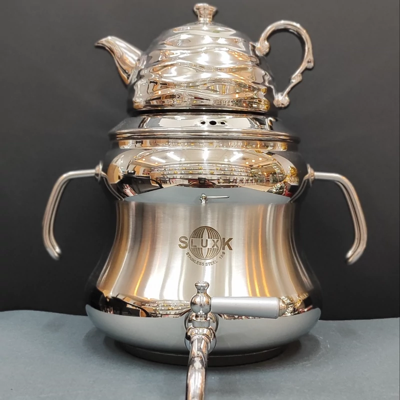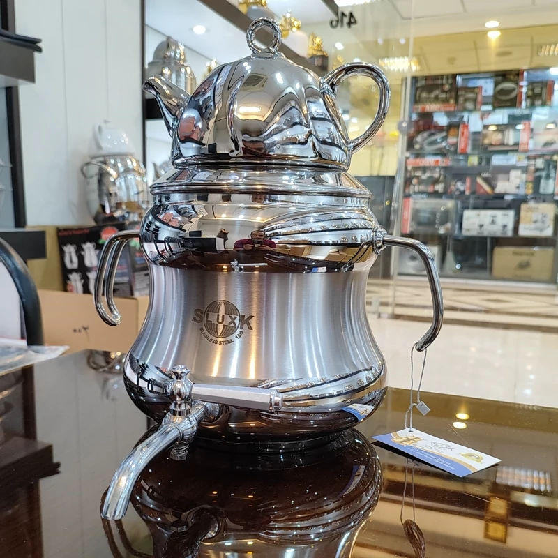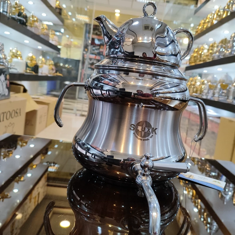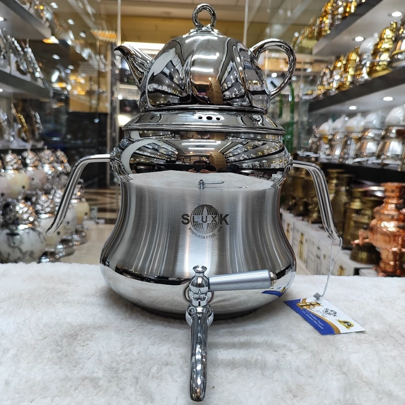 از تولیدات کارخانه با ورق استیل یک میل ضخیم کفه چدنی کف کتری که ایمنی کار که در برابر حرارت رو بالا میبره گنجایش 6لیتری کتری دسته عصایی و شیر درجه یک خارجی قوری چینی کروم شده با طراحی زیبا دارای درب شبکه ای ضمانت 24 ماهه برند اس لوکس